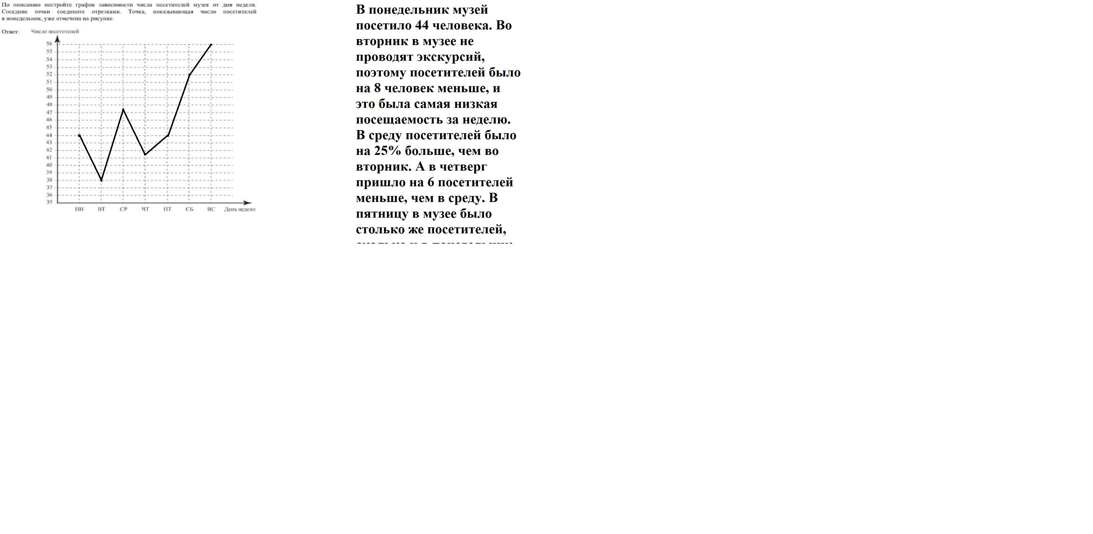 В понедельник музей посетило 44 человека. Во вторник в музее не проводят экскурсий, поэтому посетителей было на 8 человек меньше, и это была самая низкая посещаемость за неделю. В среду посетителей было на 25% больше, чем во вторник. А в четверг пришло на 6 посетителей меньше, чем в среду. В пятницу в музее было столько же посетителей, сколько и в понедельник. В выходные количество посетителей всегда увеличивается. В субботу музей посетило на 8 человек больше, чем в пятницу, аввоскресенье была самая высокая посещаемость за неделю — посетителей было на 4 человека больше, чем в субботу.