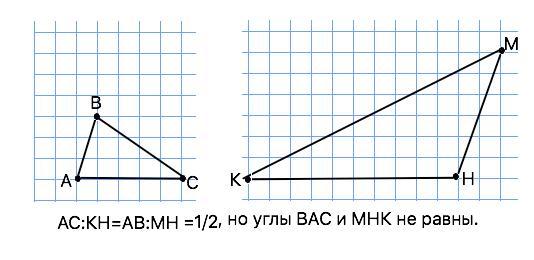 Объяснение: Если две стороны одного треугольника соответственно пропорциональны двум другим другого треугольника. то для того, чтобы были равны углы этих треугольников требуется такое же отношение и третьих сторон. (см. рисунок)