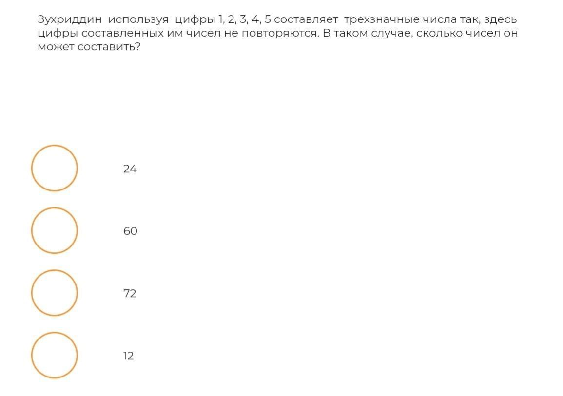 На первую позицию можно поставить любое из чисел 1, 2, 3, 4, 5, поэтому 5 вариантов