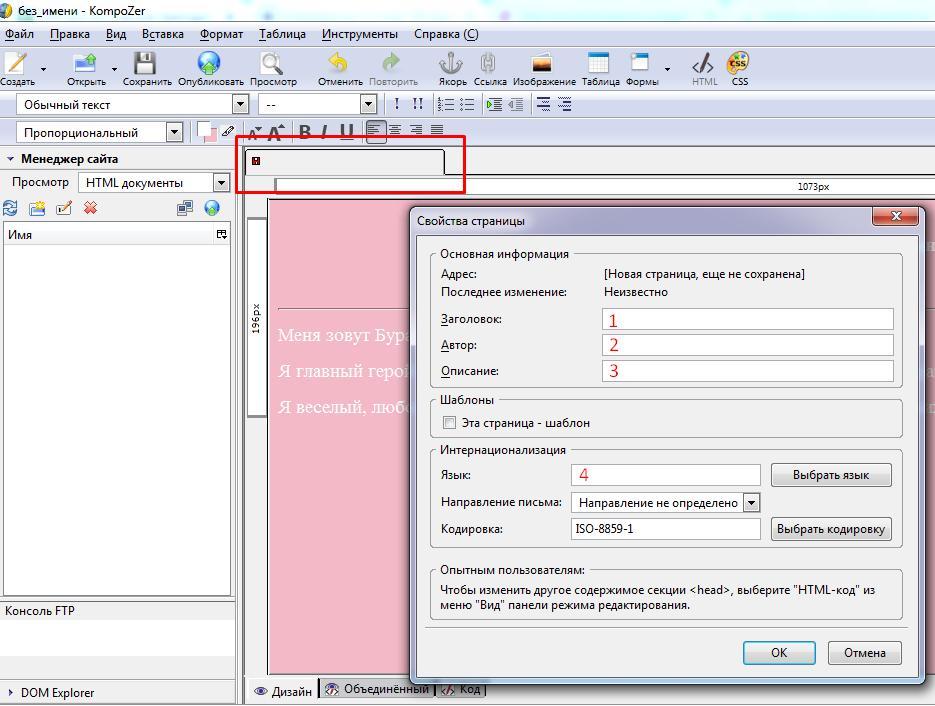 Выберите поле в диалоговом окне «Свойства страницы» редактора KompoZer, которое необходимо заполнить для отображения имени вкладки, выделенной на скриншоте красным прямоугольником? Ответ введите в числовой форме.
