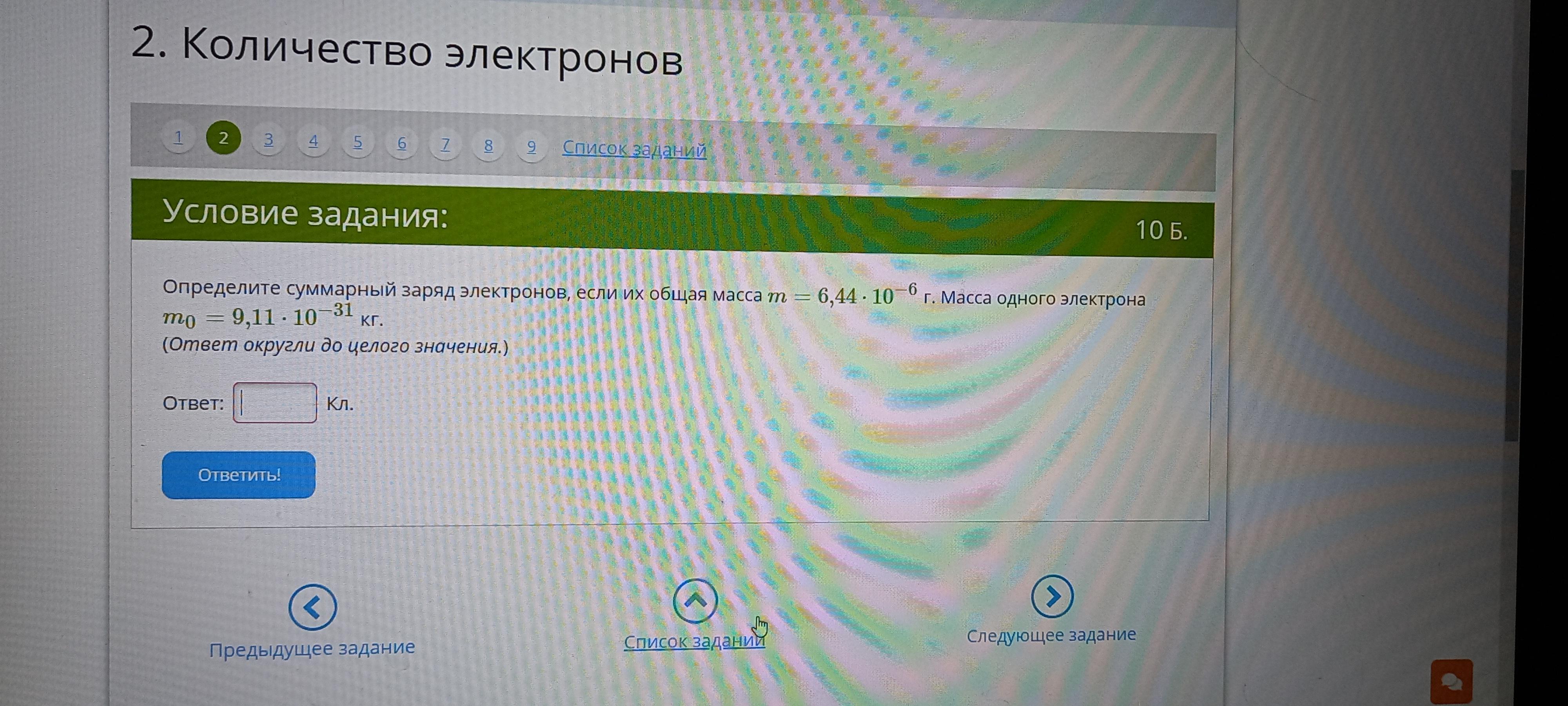 N = 6,44 * 10^-9 кг / 9,11 * 10^-31 кг = 7,1 * 10^21