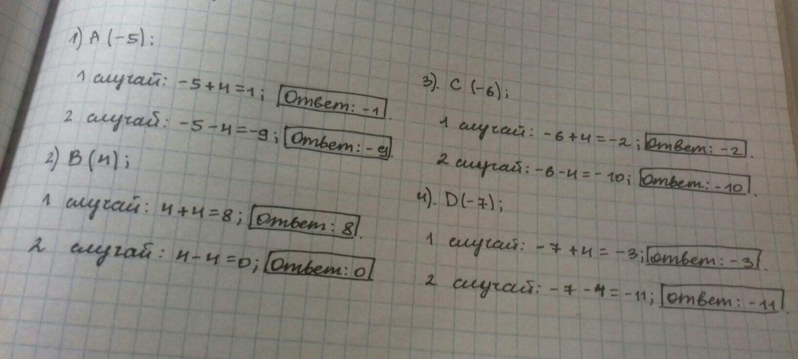 10. Найдите координаты точек, расположенных на оси на расстоянии в 4 единиц от точек: 1) А(-5); 2) В (4); 3) C (-6); 4) D(-7)