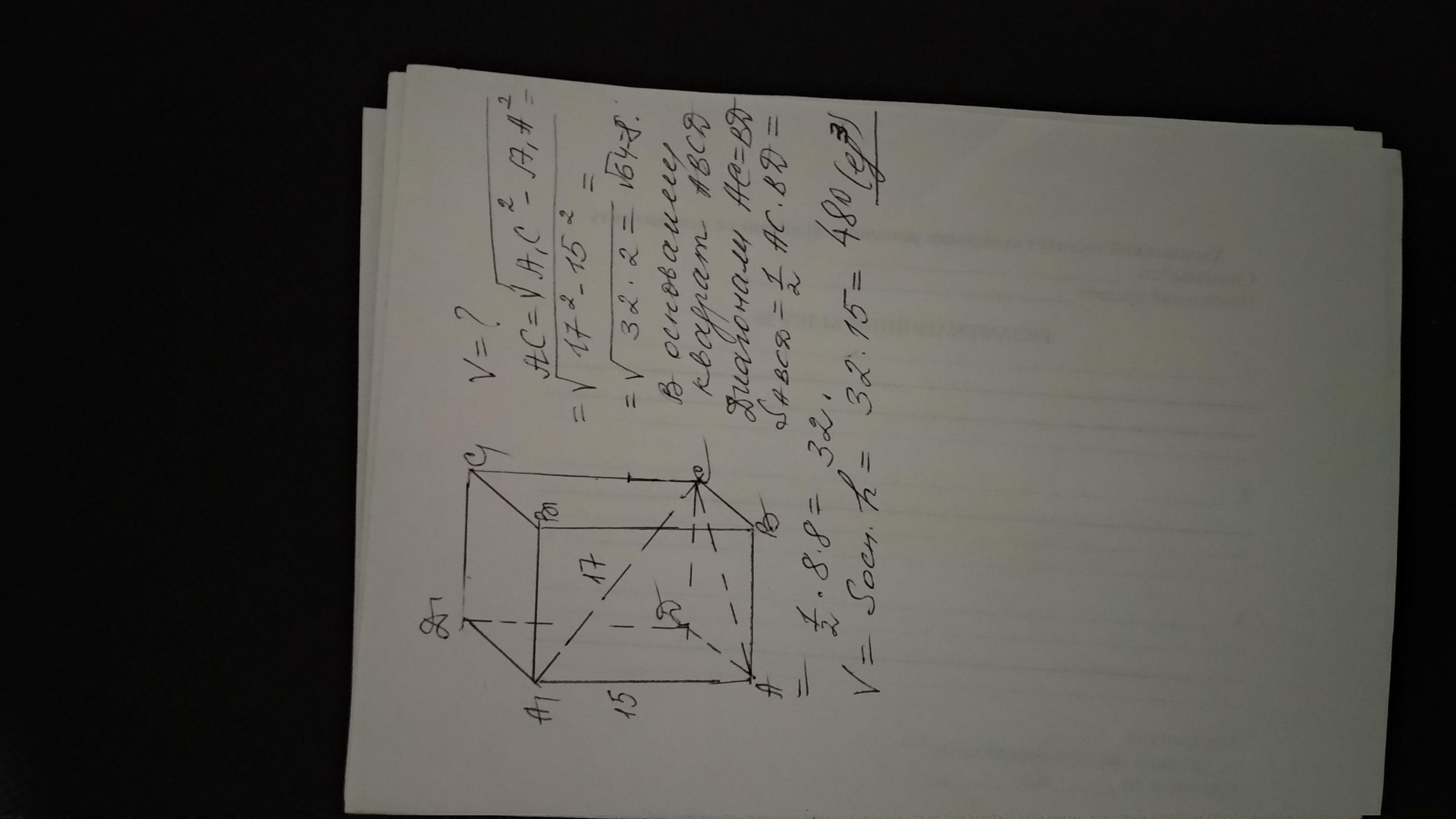 В правильной четырёхугольной призме боковое ребро 15, диагональ призмы 17. Найти объём призмы. С рисунком и объяснением, пожалуйста