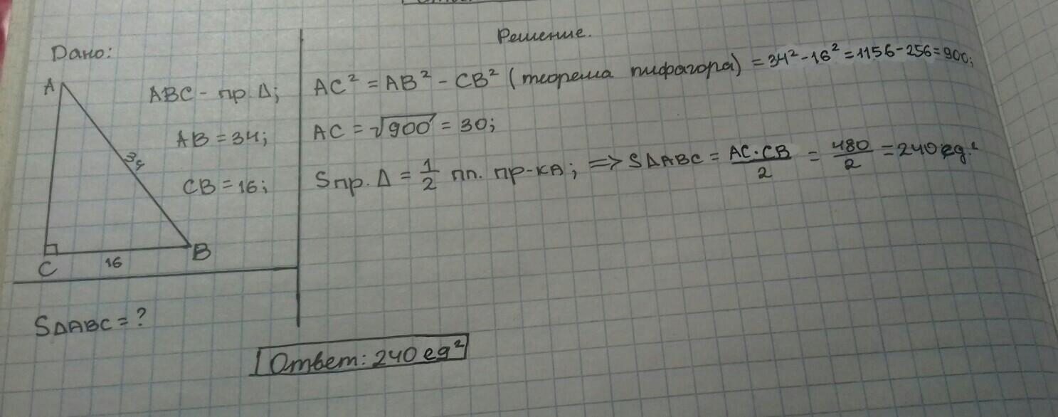 найдите площадь прямоугольного треугольника если его гипотенуза и катет соответственно равны 34 и 16