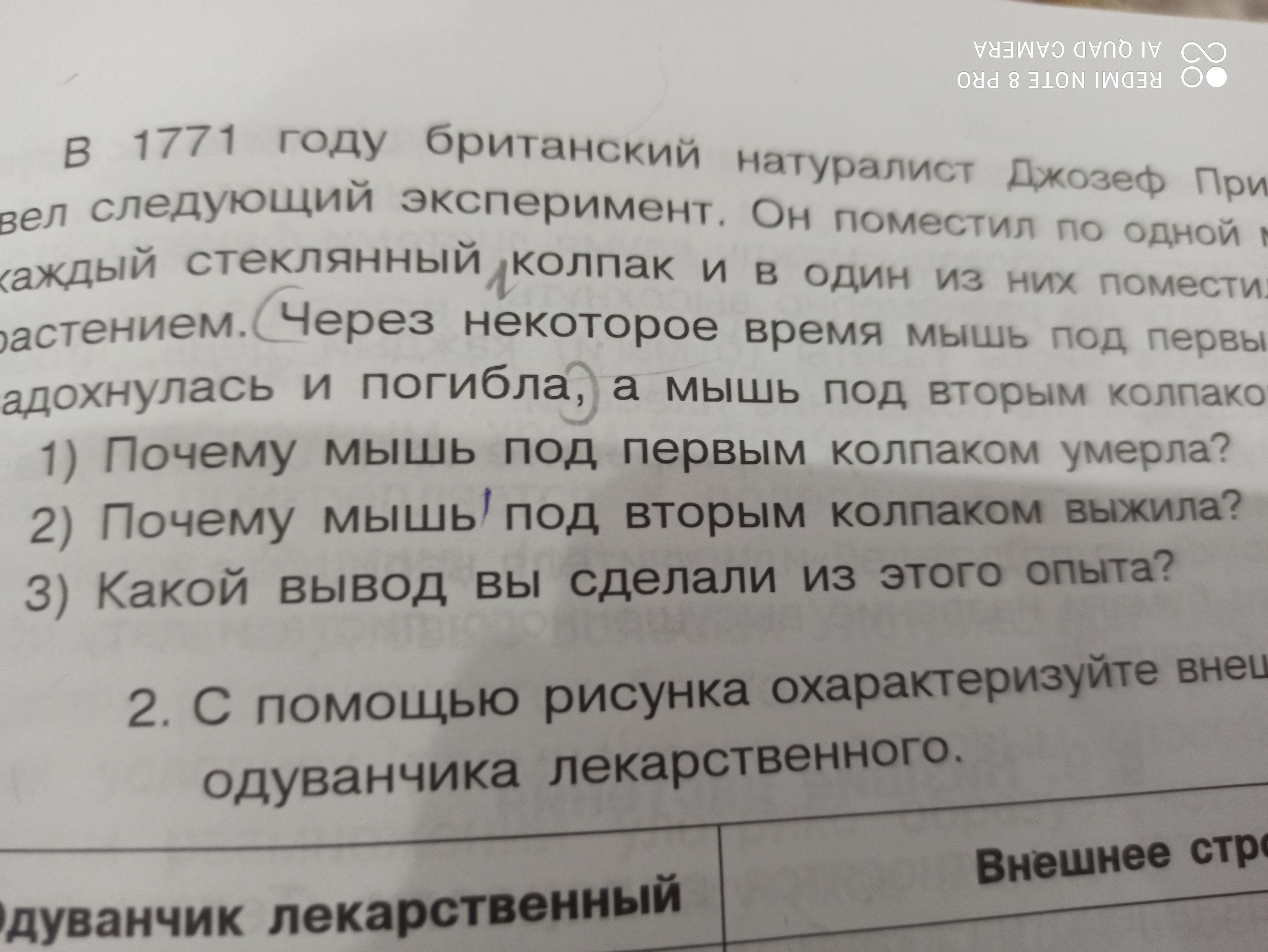 Растения вырабатывают кислород. Поэтому в колпаке без растения мышь умерла, а во втором выжила.
