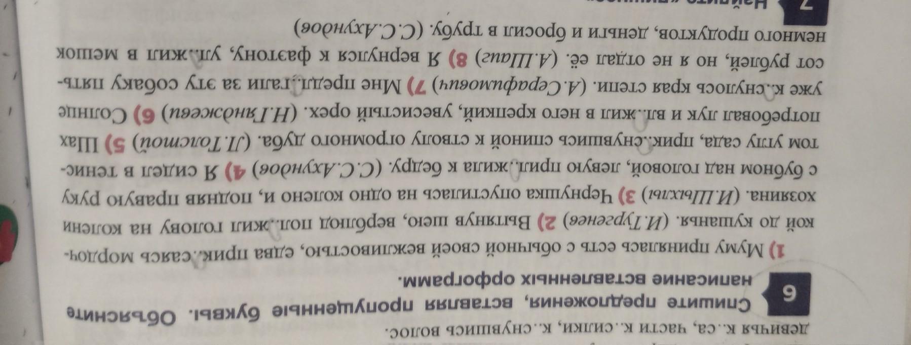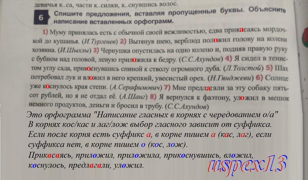 6 Спишите предложения, вставляя пропущенные буквы. Объясните написание вставленных орфограмм. 1) Муму принялась есть с обычной своей вежливостью, едва прик..саясь мордоч- Кой до кушанья. (И.Тургенев) 2) Вытянув шею, верблюд пол..жил голову на колени хозяина. (И.Шыхлы) 3) Чернушка опустилась на одно колено и, подняв правую руку с бубном над головой, левую прил., жила к бедру. (С.С.Ахундов) 4) Я сидел в тенис- том углу сада, прик..снувшись спиной к стволу огромного дуба. (Л.Толстой) 5) Шах потребовал лук и вл..жил в него крепкий, увесистый орех. (Н.Гянджеви) 6) Солнце уже к..снулось края степи. (А.Серафимович) 7) Мне предл..гали за эту собаку пять- сот рублей, но я не отдал её. (А.Шаиг) 8) Я вернулся к фаэтону, ул. жил в мешок немного продуктов, деньги и бросил в трубу. (С.С.Ахундов)