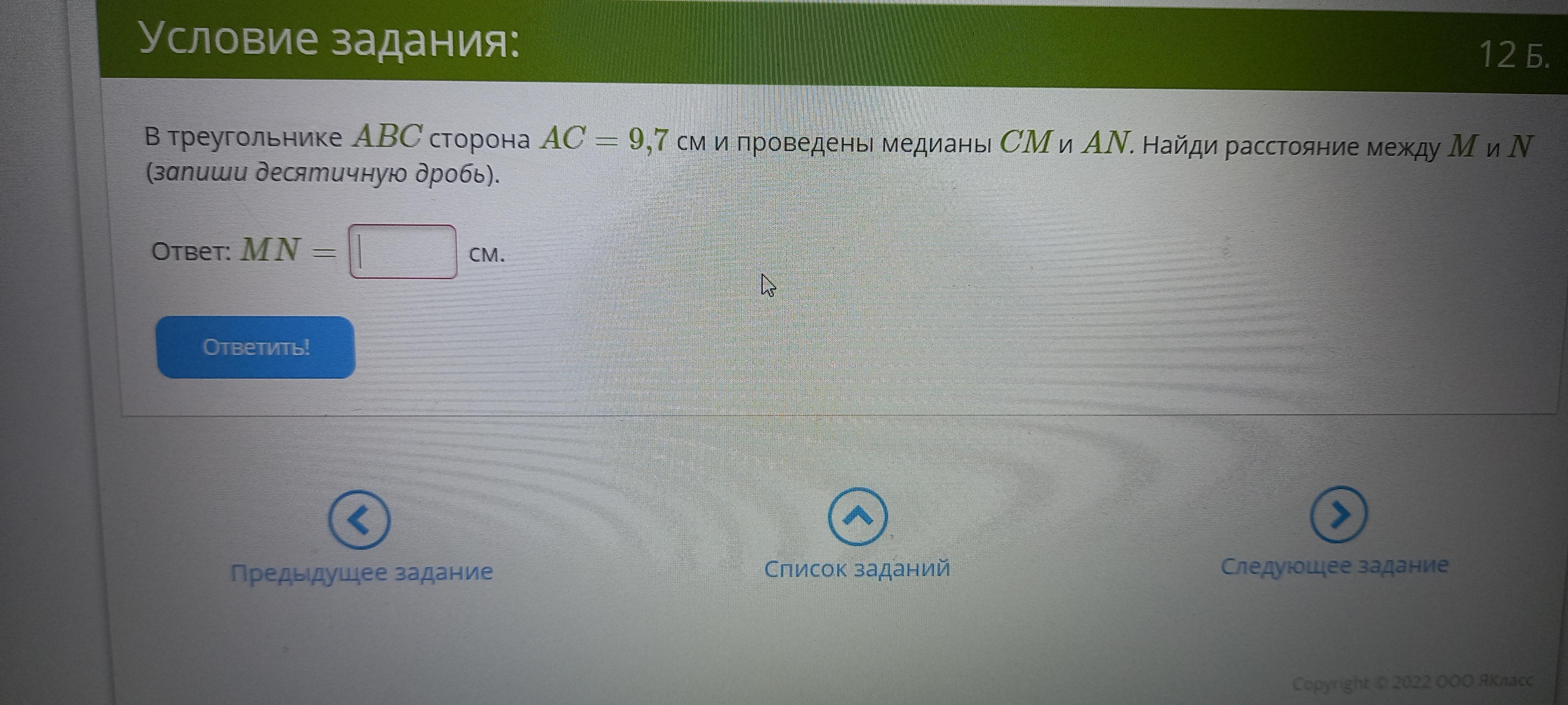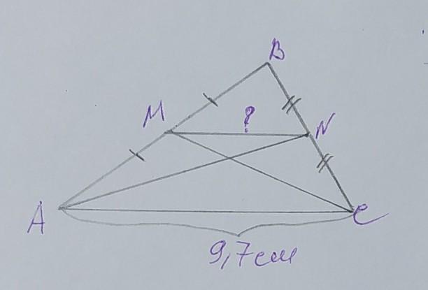 Так как медианы делят противолежащие стороны пополам, то АМ=МВ, и ВN=NC. Тогда MN – это средняя линия ∆АВС и равна половине противоположной стороне АС, тогда найдём MN: