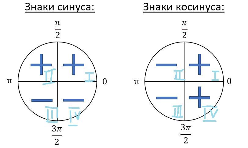 Значит, синус этого угла положительный, а косинус — отрицательный (см. вложение).