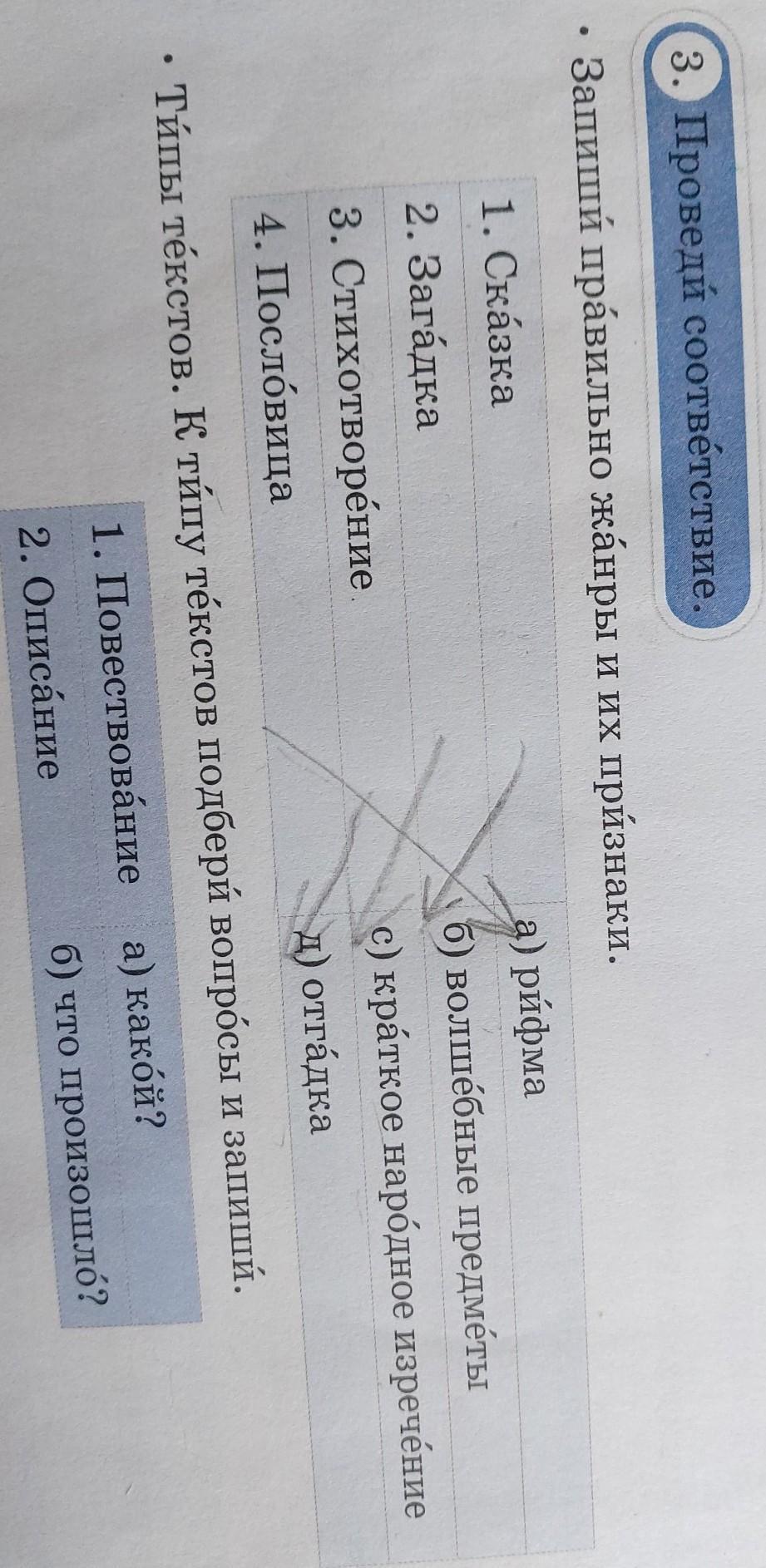 3. Проведи соответствие . Запиши правильно жанры и их признаки . 1. Сказка 2. Загадка 3 . Стихотворение 4. Пословица . • Типы текстов . К типу текстов подбери вопросы и запиши . 1. Повествование 2. Описание рифма б ) волшебные предметы с ) краткое народное изречение д ) отгадка а ) какой ? б ) что произошло ?