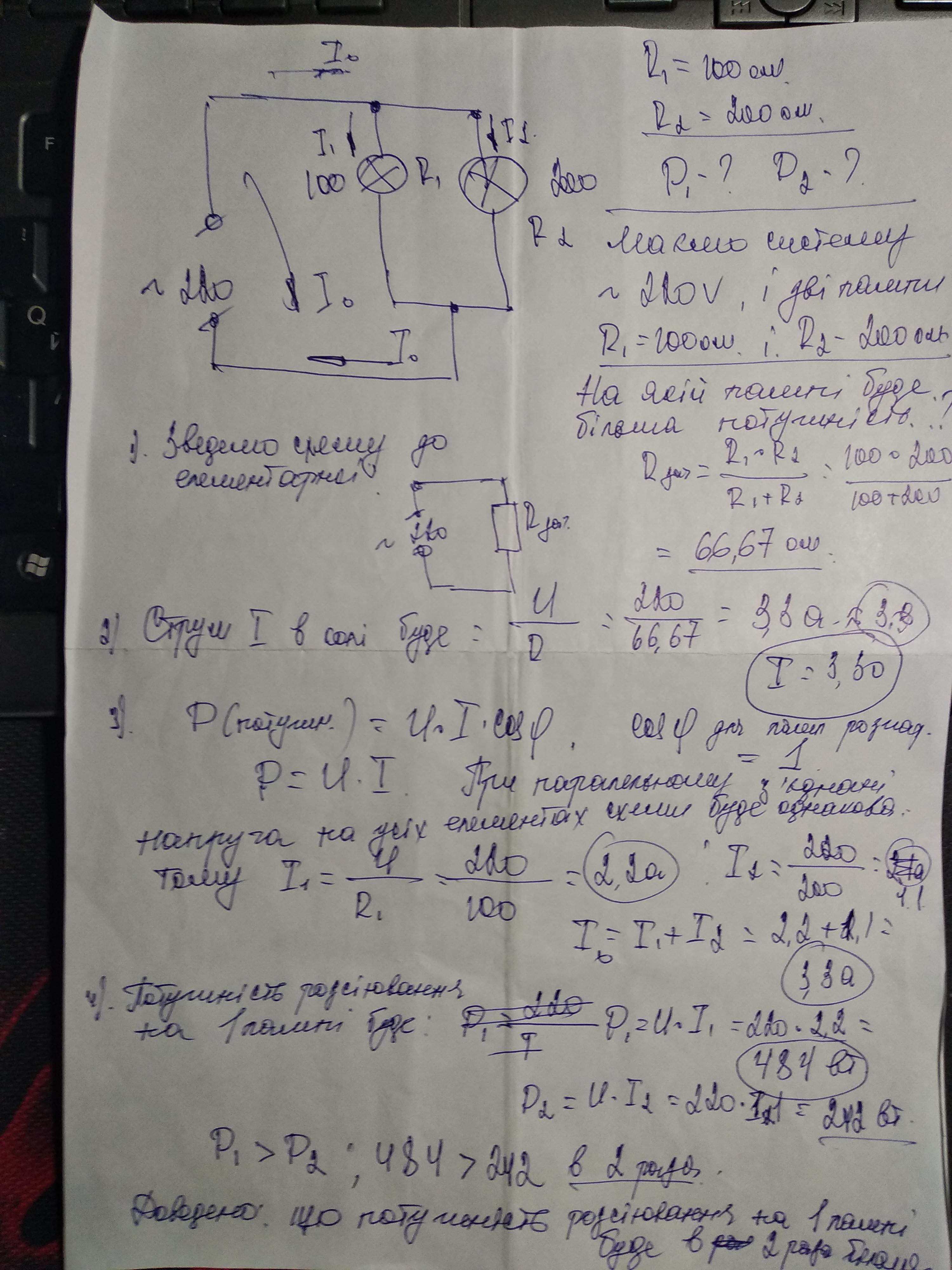Две электрические лампочки сопротивлением 100 Ом и 200 Ом параллельно включены в сеть. Какая из ламп потребляют большую мощность и во сколько раз?