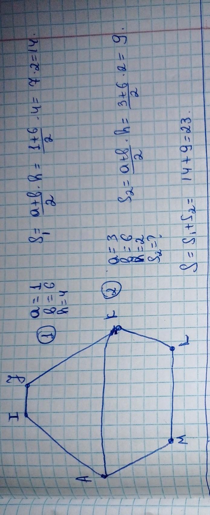 4 фигура многоугольник, если его достроить до квадрата со стороной 6 см. а потом рассмотреть еще прямоуг. треугольники с соотв. сторонами, то площадь может быть найдена как 36- площади четырех треугольников по углам. их площади соответственно равны 2*2/2=2; 4*2/2=4; 3*4/2=6; 1*2/2=1; значит, искомая площадь 36-2-4-6-1=23/ед. кв./