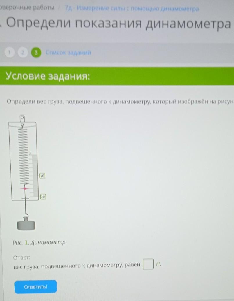 Условие задания: Определи вес груза, подвешенного к динамометру, который изображён на рисунке. -чи 10 ННІ H20 чки Рис. 1. Динамометр Ответ: Н. вес груза, подвешенного к динамометру, равен Ответить