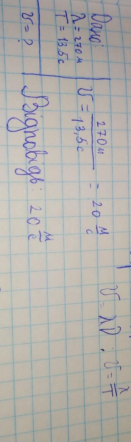 В океані довжина хвилі сягає 270м, а її період дорівнює 13,5с. Визначте швидкість поширення такої хвилі