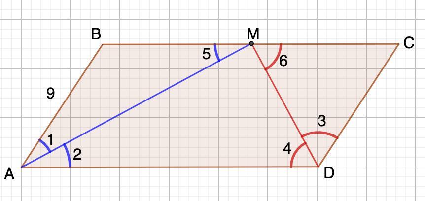 ∠6 = ∠4 (накрест лежащие при ВС || AD и секущей DM)