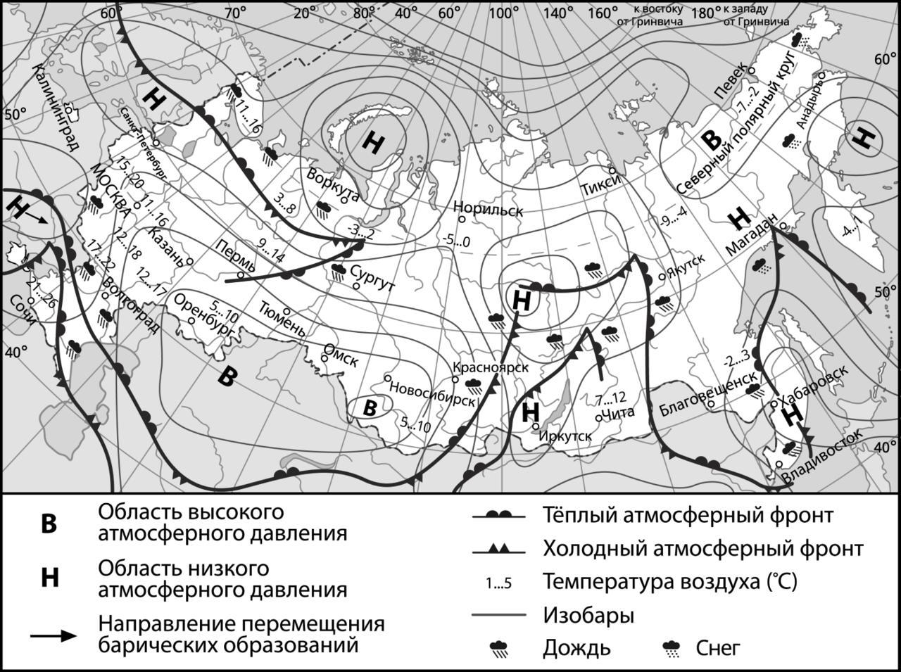 1) В зоне антициклона (В - высокое давление) находятся Новосибирск (3).
