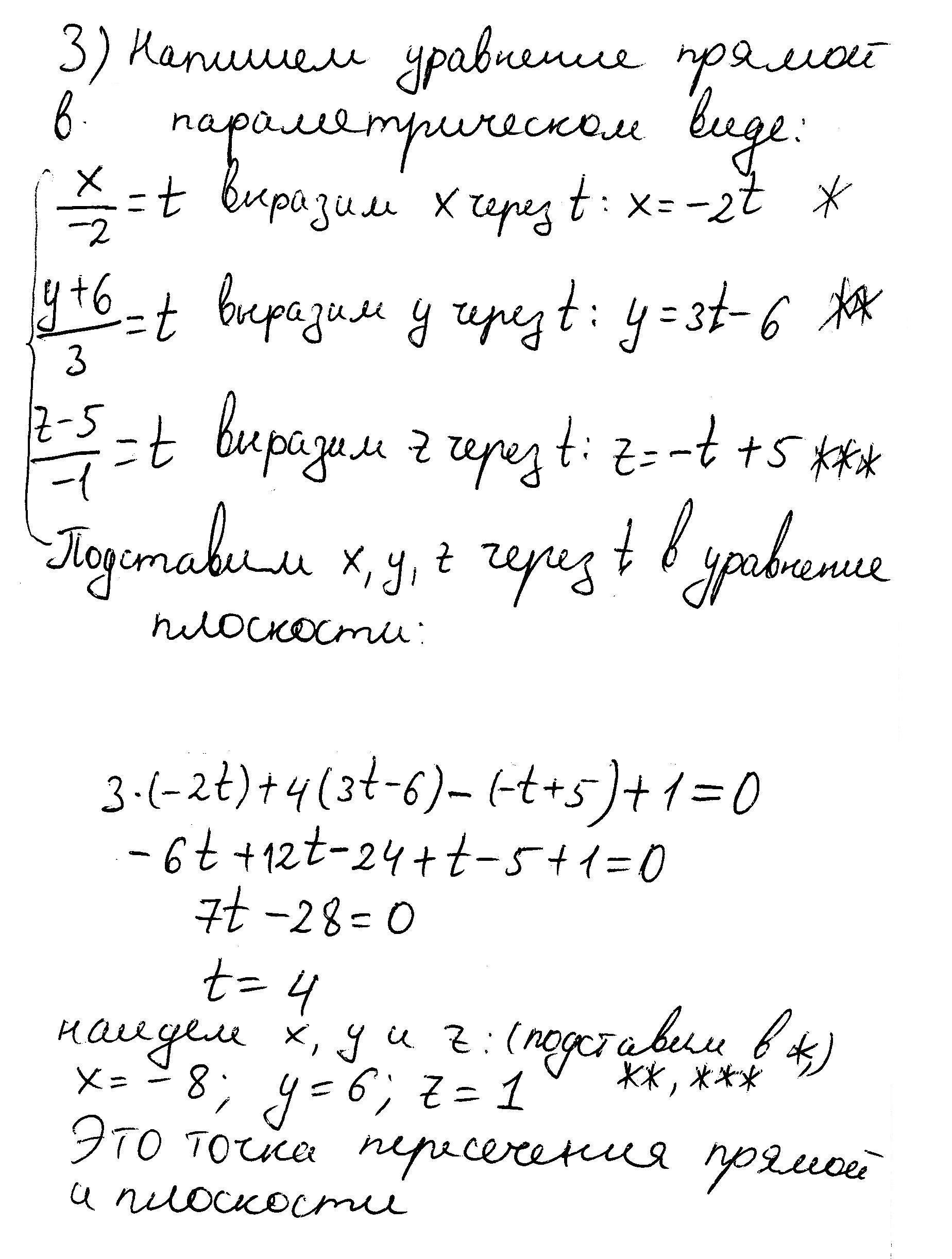 3) Найдите координаты точки пересечения прямой x/-2=y+6/3=z-5/-1 (каноническое уравнение) и плоскости 3x+4y-z+1=0