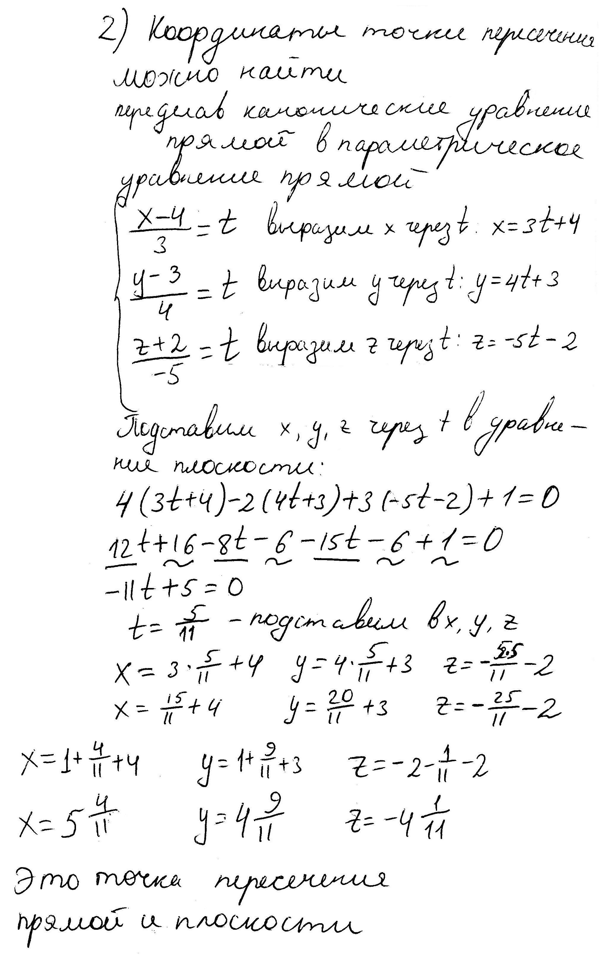 2) Найдите координаты точки пересечения прямой x-4/3=y-3/4=z+2/-5 (каноническое уравнение) и плоскости 4x-2y+3z+1=0