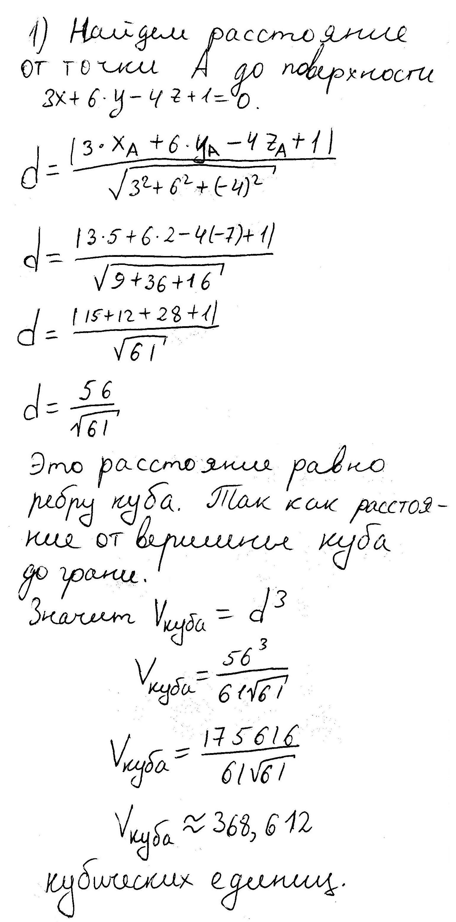 1) Каков объём куба с вершиной в точке А(5; 2; -7) гранью, лежащей на поверхности 3x+6y-4z+1=0