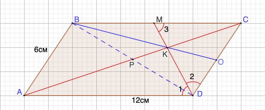 Бісектриса кута D паралелограма ABCD перетинае сторону ВС у точці м, а діагональ АС - у точці К. Відомо, що АВ = 6 см, ВС = 12 см. Знайдіть вiдрiзки, на які пряма ВК ділить сторону CD.