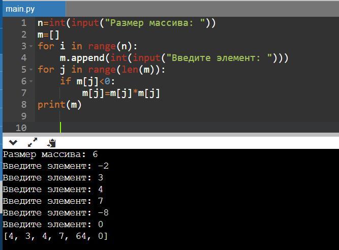 информатика 9 класс 28(2) Дан одномерный массив. Замените все отрицательные элементы массива их квадратами, положительные элементы оставьте без изменения. Входные данные для размерности массива и значения элементов массива задайте самостоятельно.
