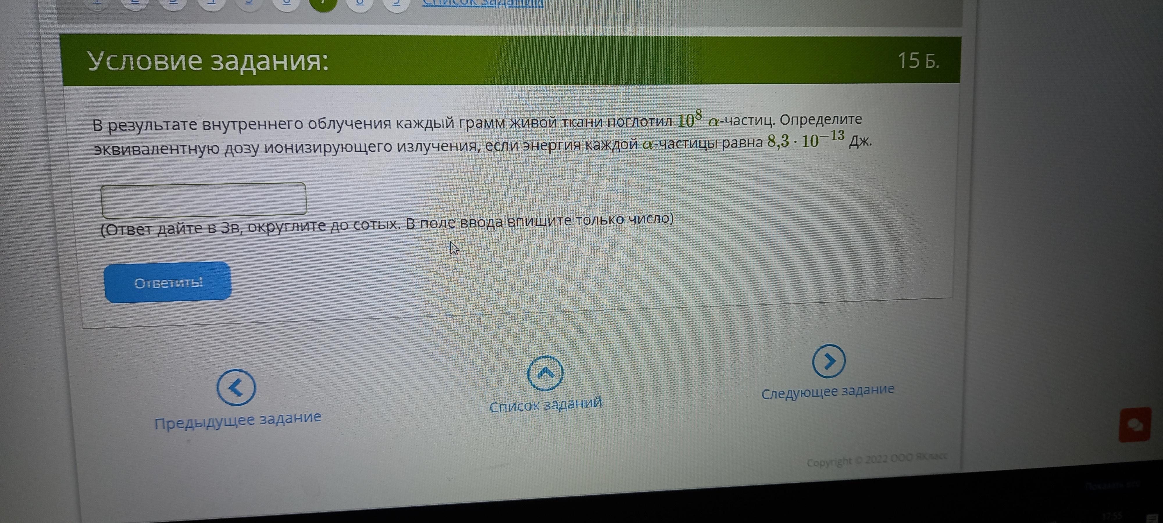 И последнее найдём эквивалентную дозу поглощенного излучения по формуле =>Н=D×K => 8.3×10^-2×20=1.66 гр или 1,66 Зв