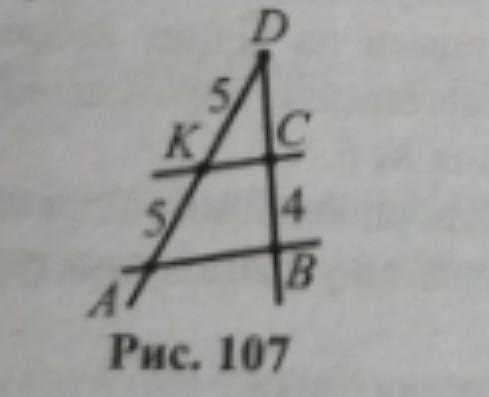 Срочно!!!на рисунку 107 прямі KC і AB паралельні.Знайдить довжину відрізка DB