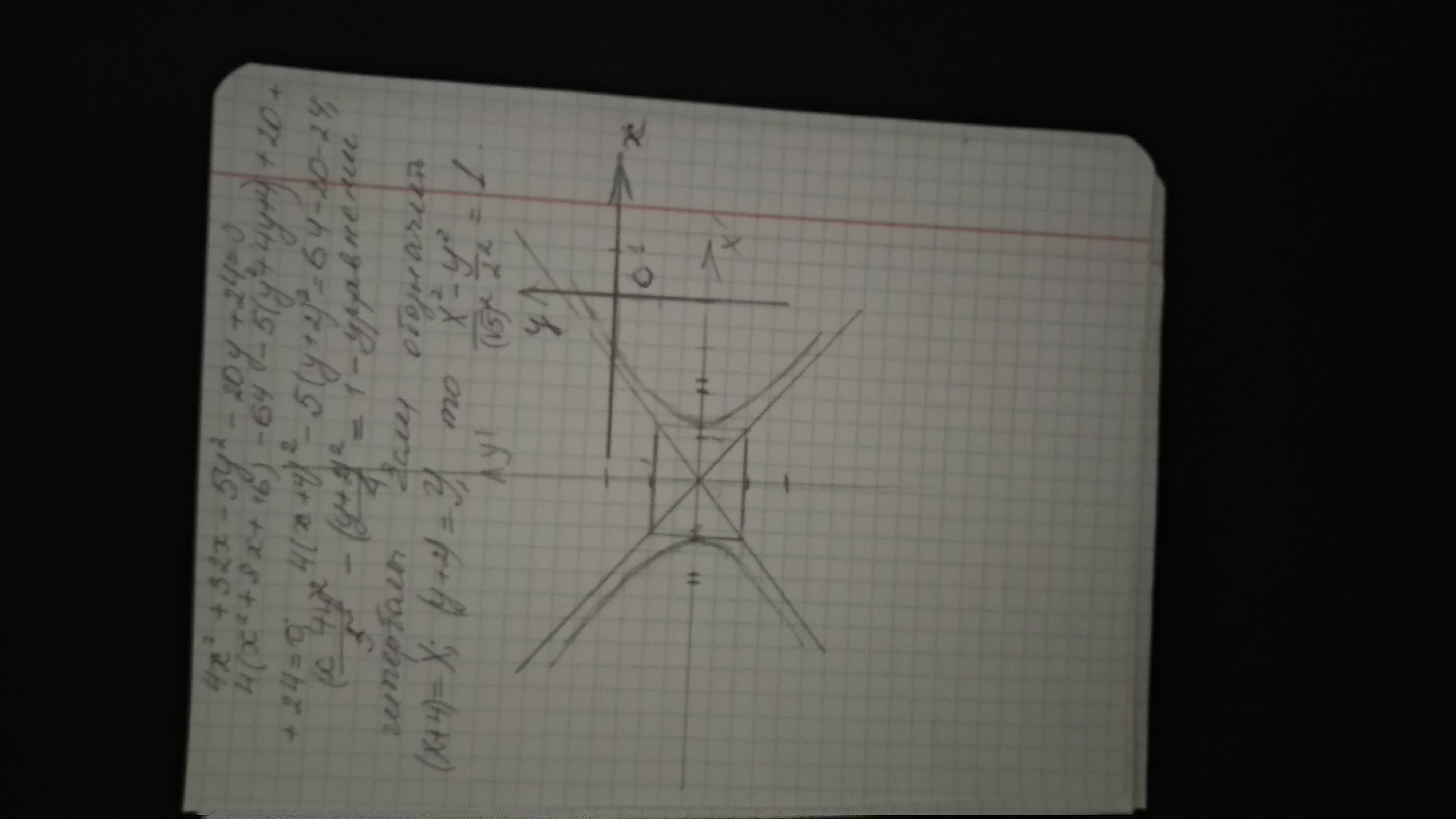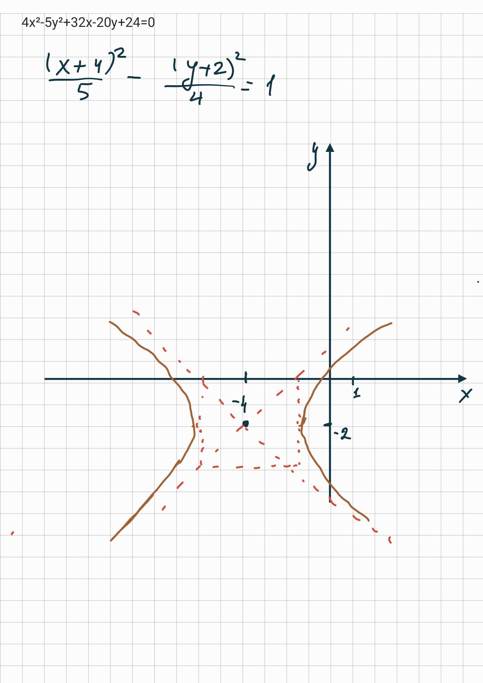 сначала построил уравнение X²/5-Y²/4=1, затем центр можно было перенести в точку (-4;-2) и получил (х+4)²/5 - (у+2)²/4=1, но лучше переносить систему координат, т.е. оси на две единицы вверх и 4 вправо