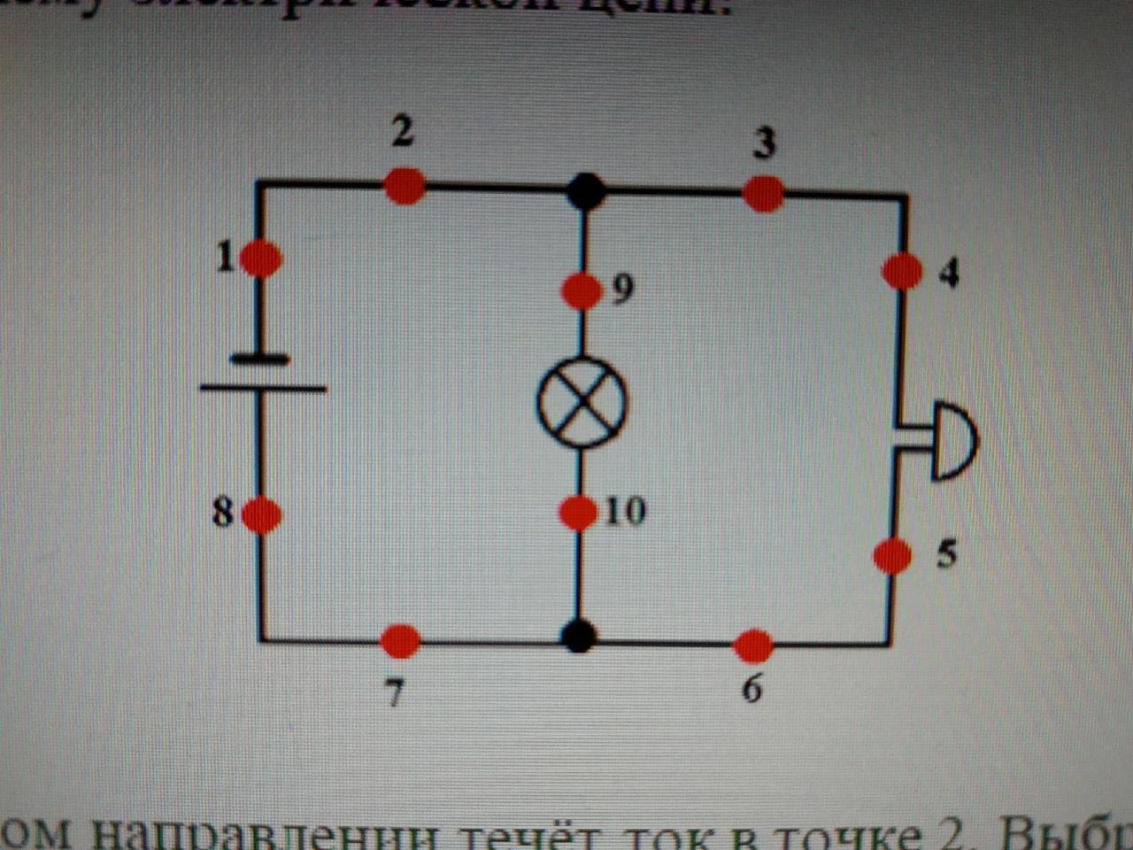 Укажи, в каком направлении течёт ток в точке 2. Выбрать и записать ответ.