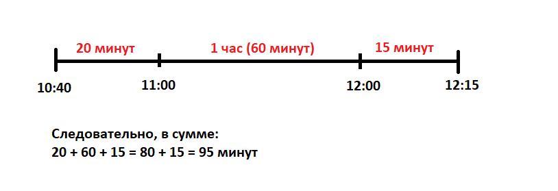 Сначала считаем, сколько минут будет от 10:40 до 11, затем от 11 до 12, после от 12 до 12:15. Оставшееся решение на скрине.