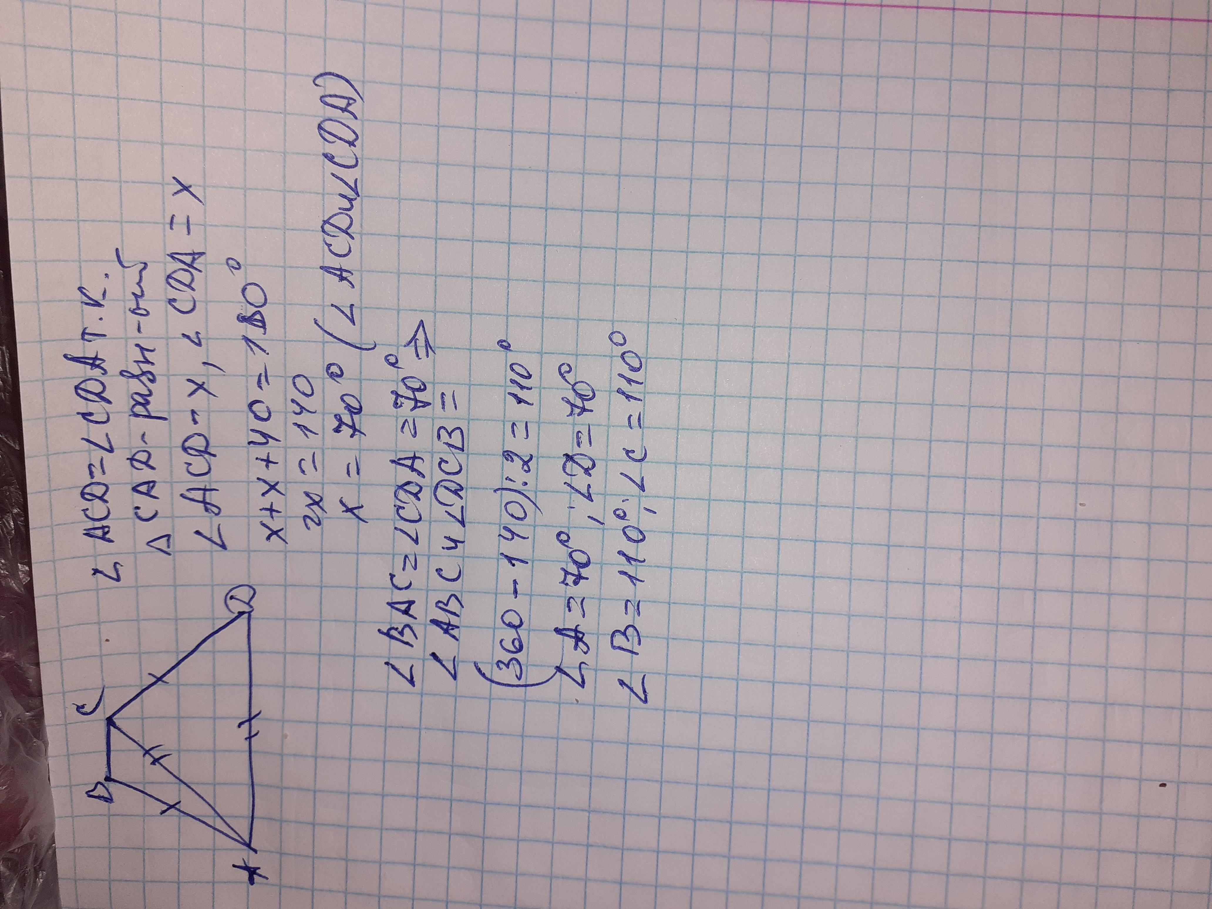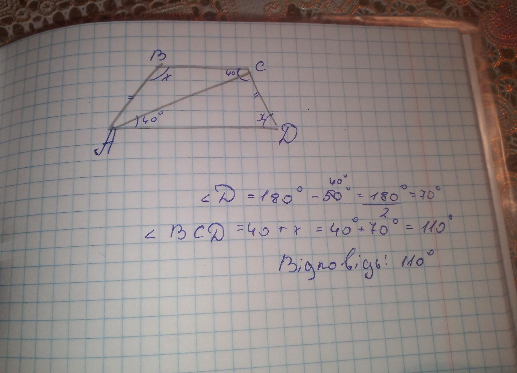 у рівнобічній трапеції діагональ дорівнює більшій основі і утворює з нею кут 40°. Знайти кути трапеції