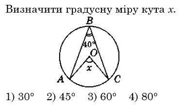 По правилу угол АВС=0,5 дуги АС. Дуга АС=80°, а угол, вершина которого лежит в центре окружности, равен дуге, на которую он опирается. Вывод: АОС (х) = 80°