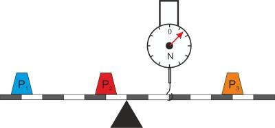 Дан рычаг с двумя грузами P1=76Н и P2=89Н на одной стороне. На другой стороне рычага находится груз P3=537Н и динамометр.