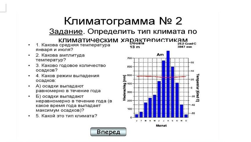 - Какова амплитуда температур? Амплитуда температур — разница между самой высокой и самой низкой температурой. Поскольку январь самый холодный, а июль — самый тёплый месяц для Дуалы (по графику), а среднюю температуру января и июля мы уже знаем, от нас требуется определить разницу, это и будет амплитудой. Итак, амплитуда температур будет равна примерно 1 градусу Цельсия (26 - 25).