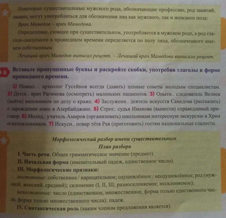 Вставьте пропущенные буквы и раскройте скобки, употребив глаголы в форме 6 прошедшего времени. 1) Пожил... археолог Гусейнов всегда (давать) ценные советы молодым специалистам. 2) Детск. врач Рагимова (осмотреть маленьких пациентов. 3) Опытн.. следователь Велиев (найти) виновников по делу о краже. 4) Заслуженн.. деятель искусств Самедова (рассказать) о зарождении кино в Азербайджане. 5) Строг.. судья Иманова (вынести) справедливый при- говор. 6) Молод. учитель Амиров (организовать) школьникам интересную экскурсию в Храм огнепоклонников. 7) Искусн.. повар тётя Рая (приготовить) гостям национальные сладости.