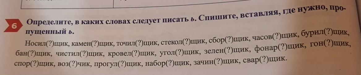 Носильщик, каменщик, точильщик, стекольщик, сборщик, часовщик, бурильщик, банщик, чистильщик, кровельщик, угольщик, зеленщик, фонарщик, гонщик, спорщик, возчик, прогульщик, наборщик, зачинщик, сварщик.
