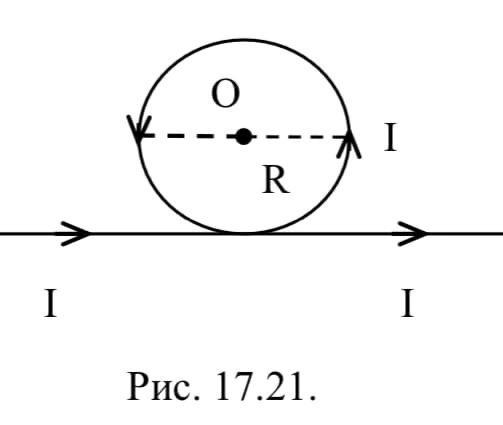 По плоскому контуру из тонкого провода, изображенному на рис. 17.21, идет ток I=50 А. Определите магнитную индукцию В поля, создаваемого током в точке О. Радиус изогнутой части контура равен R=0,1 м.