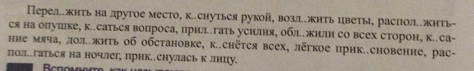 ПерелОжить на другое место ( правописание -лаг- и -лож- ), кОснуться рукой ( правописание -кас- и -кос- ), возлОжить цветы ( правописание -лаг- и -лож- ), располОжиться на опушке ( правописание -лаг- и -лож- ), кАсаться вопроса ( правописание -кас- и -кос- ), прилАгать усилия ( правописание -лаг- и -лож- ), облОжили со всех сторон ( правописание -лаг- и -лож- ), кАсание мяча ( правописание -кас- и -кос- ), долОжить об обстановке ( правописание -лаг- и -лож- ), кОснётся всех ( правописание -кас- и -кос- ), лёгкое прикОсновение ( правописание -кас- и -кос- ), располАгаться на ночлег ( правописание -лаг- и -лож- ), прикОснулась к лицу ( правописание -кас- и -кос- ).