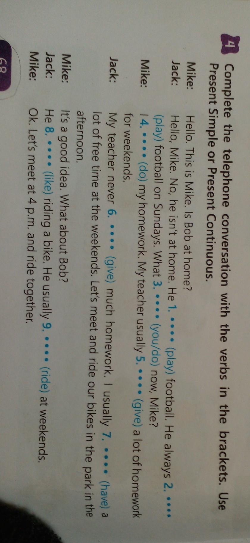 4 Complete the telephone conversation with the verbs in the brackets. Use Present Simple or Present Continuous. Mike: Jack: Mike: Hello. This is Mike. Is Bob at home? Hello, Mike. No, he isn't at home. He 1..... (play) football. He always 2..... (play) football on Sundays. What 3..... (you/do) now, Mike? I 4..... (do) my homework. My teacher usually 5.... (give) a lot of homework for weekends. My teacher never 6. .... (give) much homework. I usually 7..... (have) a lot of free time at the weekends. Let's meet and ride our bikes in the park in the afternoon. It's a good idea. What about Bob? He 8. (like) riding a bike. He usually 9..... (ride) at weekends. Ok. Let's meet at 4 p.m. and ride together. Jack: Mike: Jack: Mike: