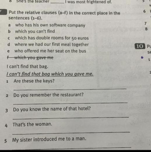 Put the relative clauses (a-f) in the correct place in the sentences (1-6).