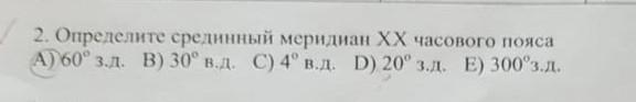 Объяснение: от Гринвичского (24-го)ч. п. до 20-го ч.п. к западу: 24-20=4 часовых пояса. Разница между срединными меридианами часовых поясов равна 15°, следовательно срединный меридиан 20-го ч.п. – 0°+4•15=60°з.д.