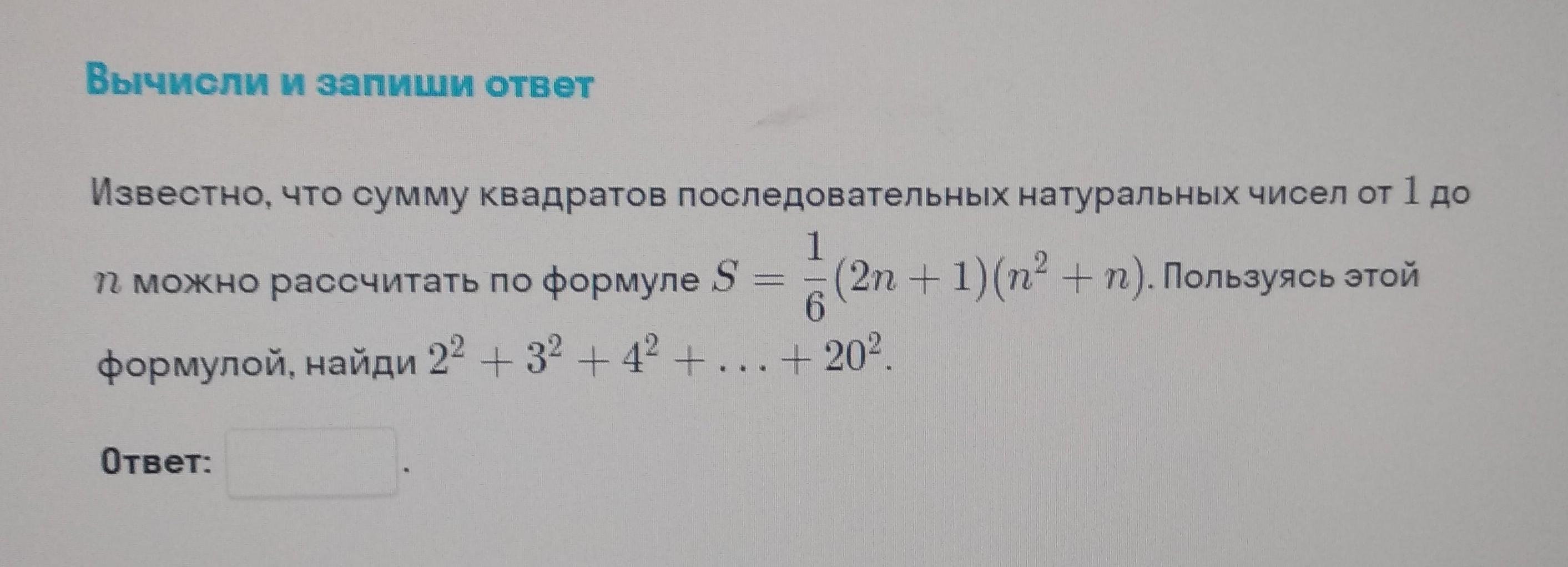 Известно, что сумма квадратов последовательный натуральных чисел от 1 до n можно рассчитать по формуле S= 1/6*(2n + 1)*(n^2 + n). Пользуясь этой формулой, найди 2^2 + 3^2 + 4^2 + ... + 20^2.