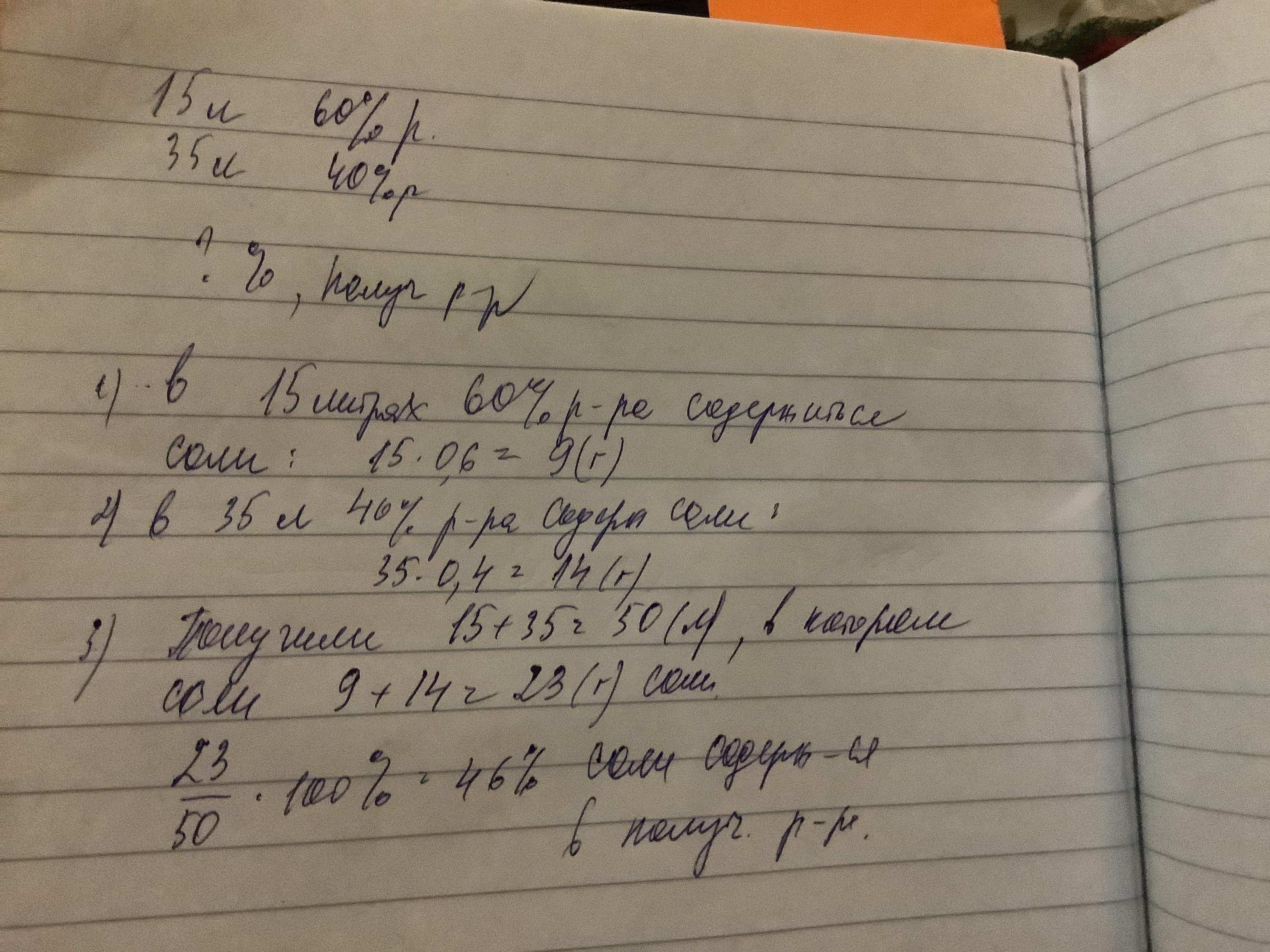 Смешали 15 л 60%-го и 35 л 40%-го растворов соли. Сколько процентов СОЛИ содержит полученный раствор?