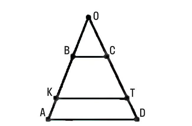Продолжение боковых сторон трапеции ABCD, BA||AD пересекаются в точке O. Прямая KT||BC, BKЭAB, DTЭCD. BK=4,AK=3,CT=8, OC=12. Найди DT и OB