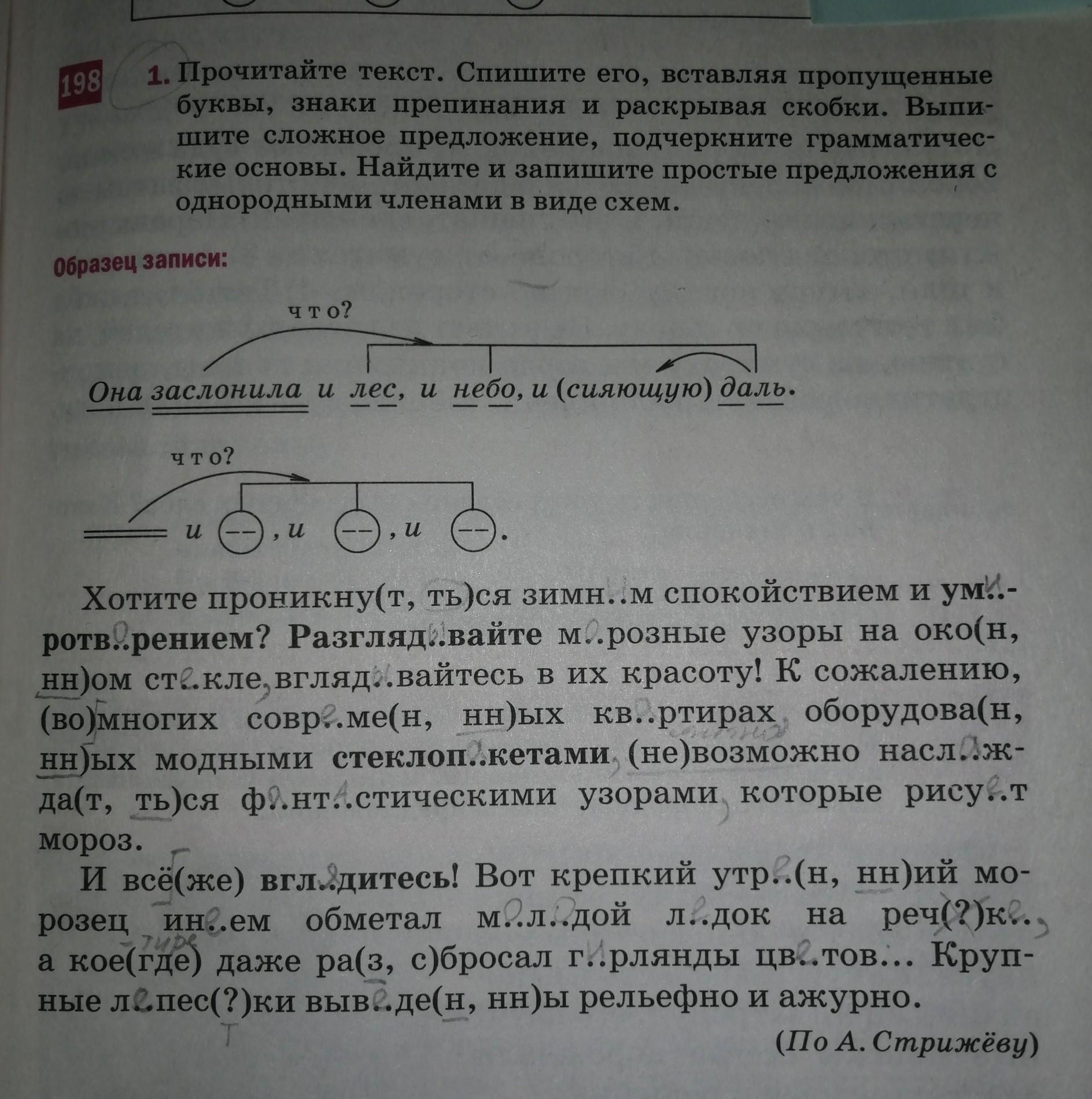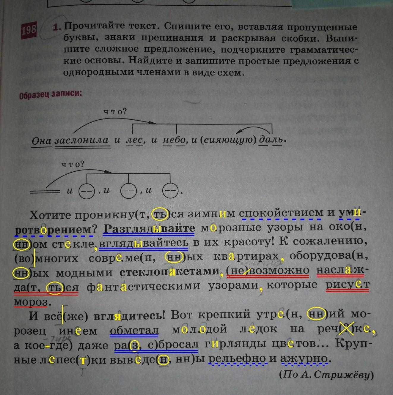 Синим подчёркнуты однородные члены предложения, красным - грамматические основы сложного предложения.