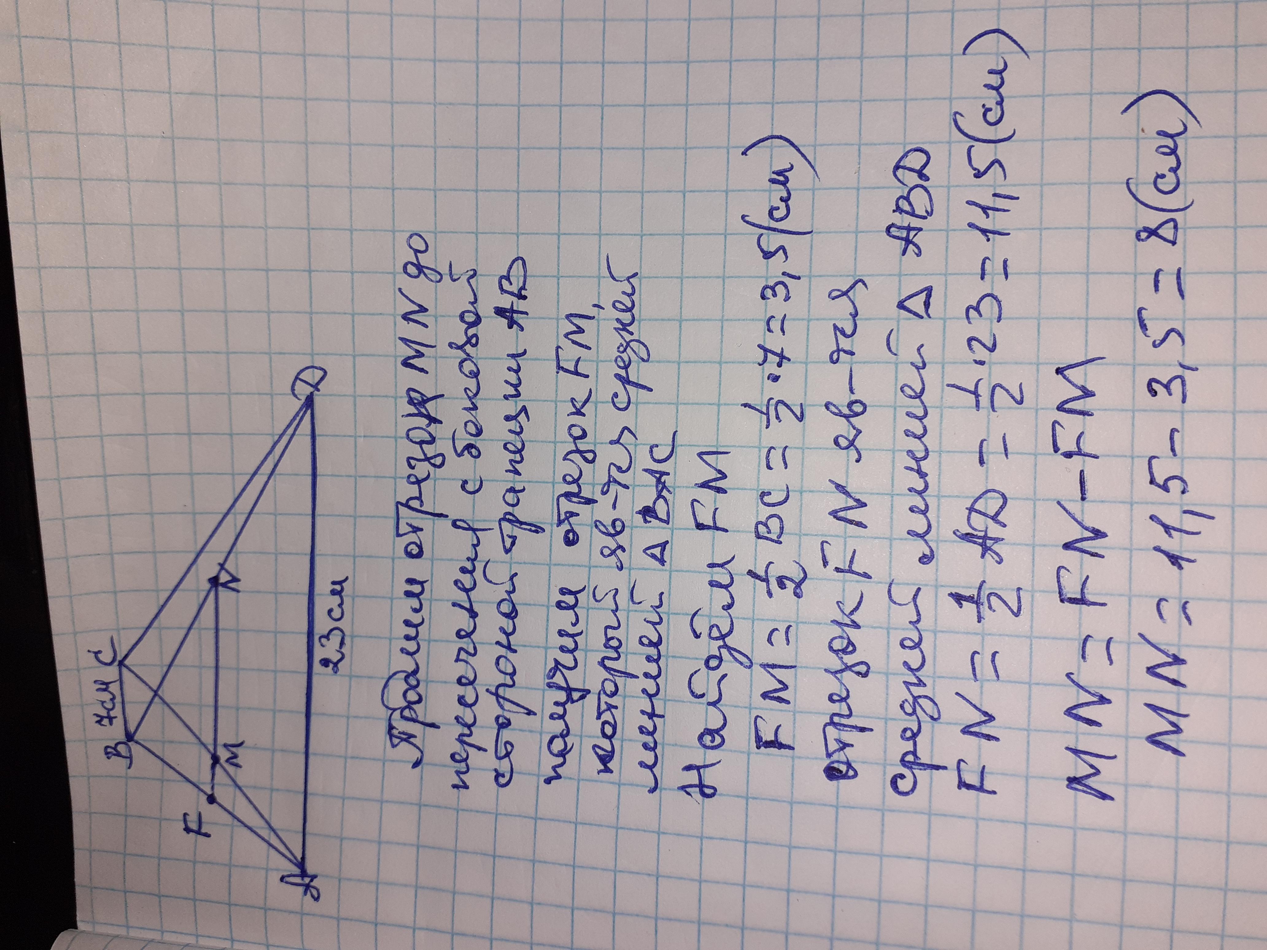 Из свойства средней линии трапеции: MN=(a-b)/2=(23-7)/2=8 см.