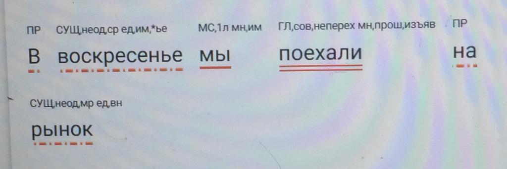 В(предлог) воскресенье(сущ) мы(мест) поехали(глагол) на(предлог) рынок(сущ).