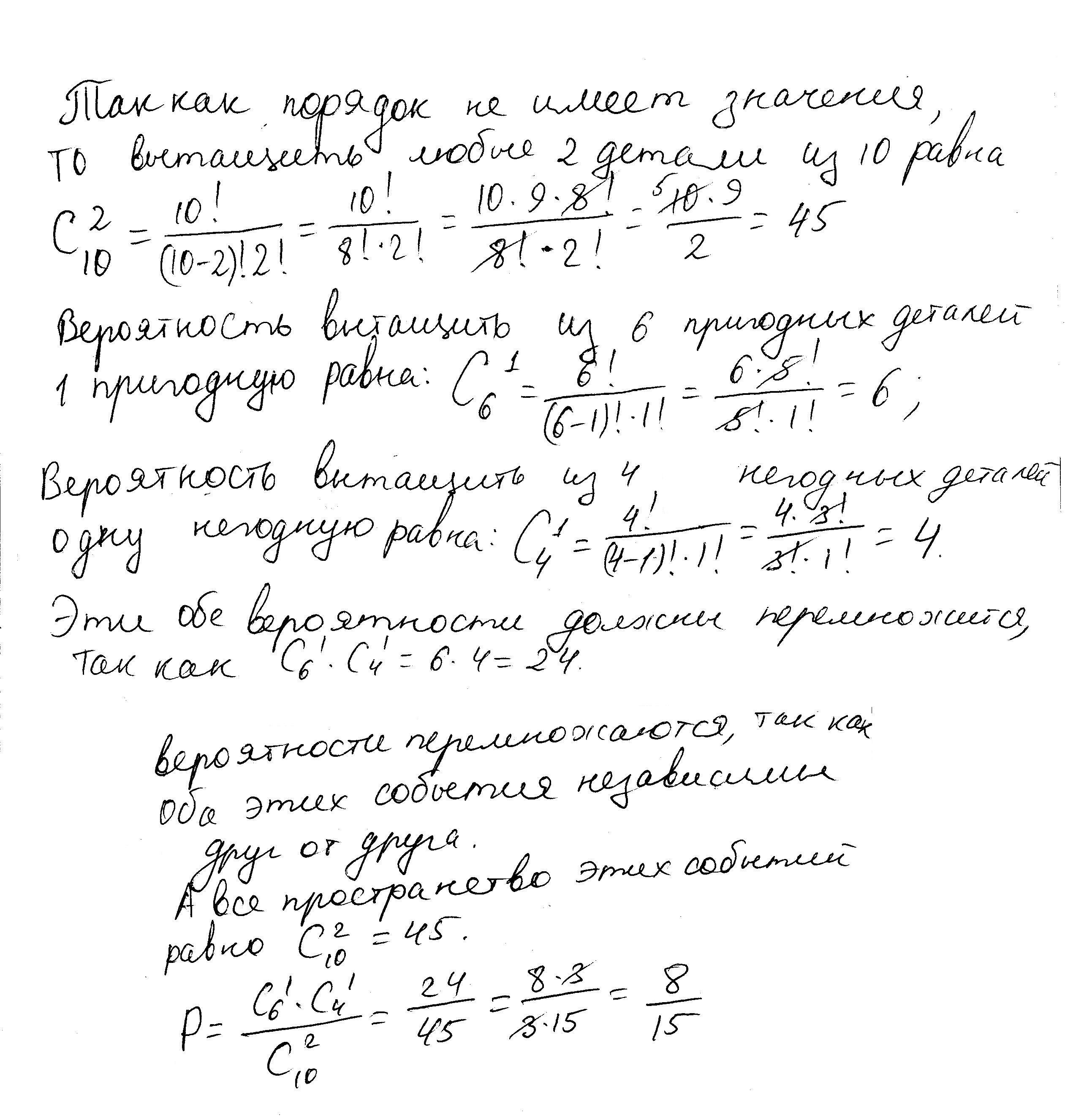 Партия из 10 деталей содержит 4 бракованных. Найти вероятность, что из двух наугад взятых деталей будут 1 пригодна и 1 бракована.