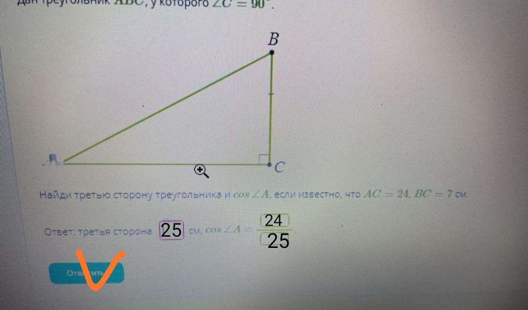 АВ=√(АС²+СВ²)=√(24²+7²)=25 см.