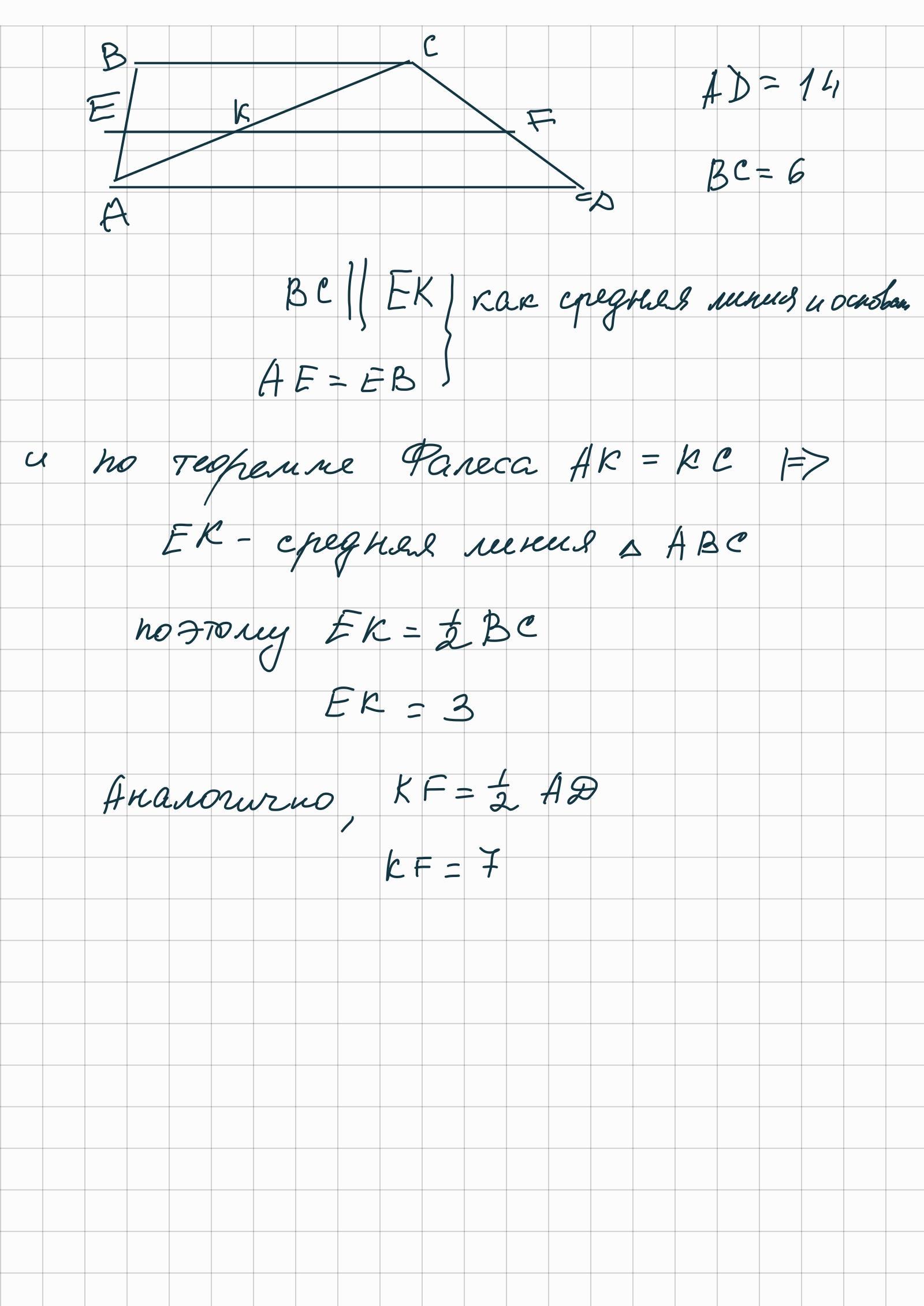 В трапеции ABCD проведена средняя линия EF, точка E лежит на боковой стороне AB, точка F лежит на стороне CD. Диагональ AC пересекает EF в точке K. Найди EK, если AD=14, BC=6.