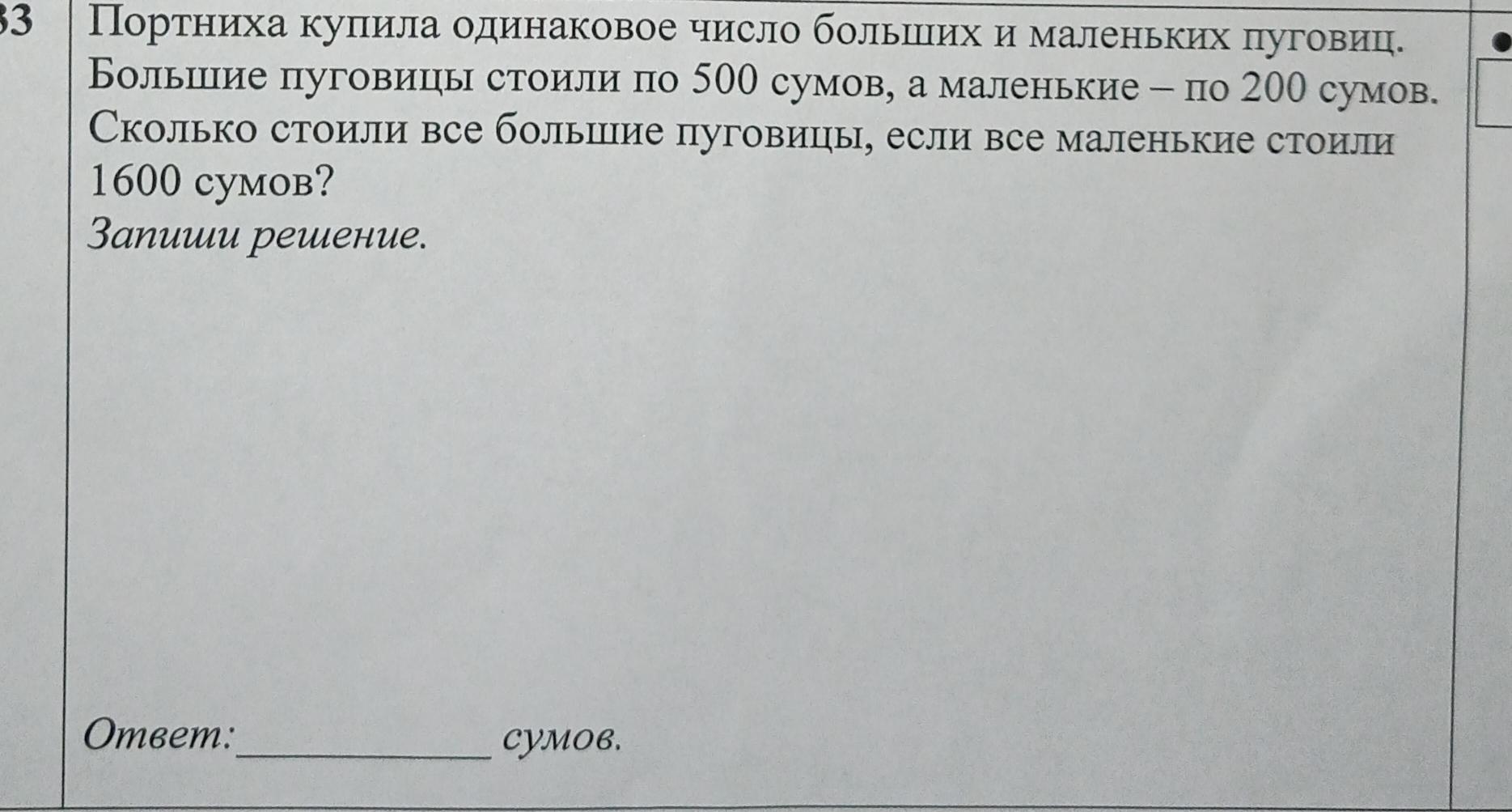 так как она купила одинаковое кол-во больших и маленьки,а мы знаем что мальких 8 то узнаем что больших тоже 8 и каждая стоит по 500сумов: